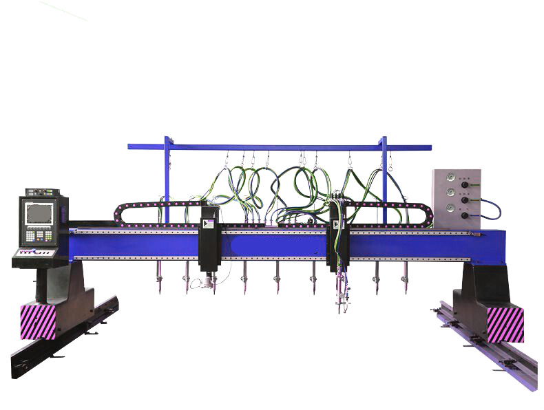 CNC-CG-4000數控多頭直條火焰切割機是我廠在吸收國內外先進軟硬件技術,為配套金屬結構件加工而自行研制和開發的一種高效率自動切割下料設備,可縱向和橫向直線切割,也可圓弧曲線的平面幾何圖形切割,切割表面粗糙度及精度要求高,變形小,9組直條割炬可以同時切割,這樣板材不變形同時又提高了生產效率。該機具有結構合理,操作簡單,工藝先進等優點。